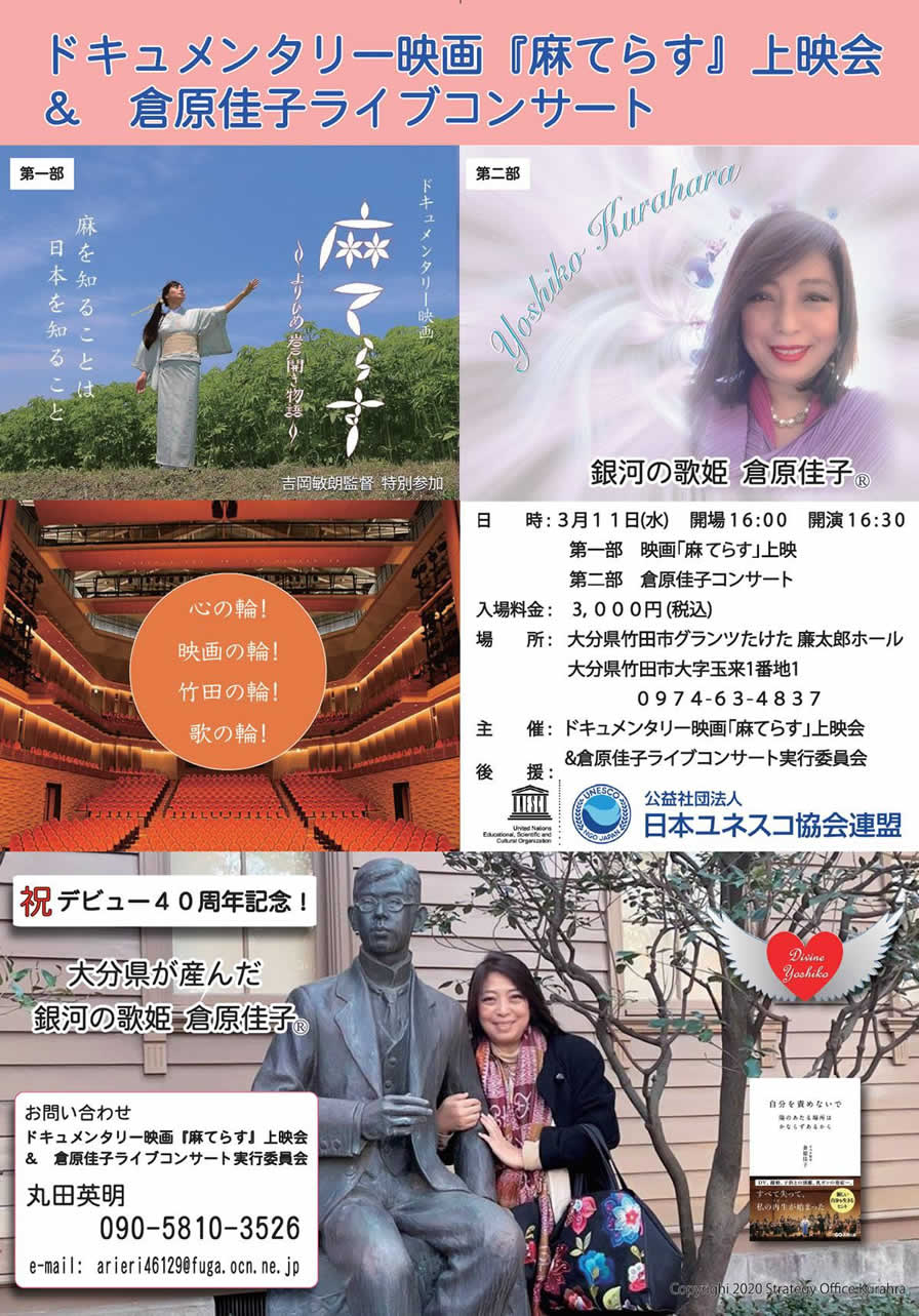 銀河の歌姫 倉原佳子ライブコンサートご案内 銀河の歌姫 倉原佳子ライブコンサート 〜大分県が産んだ世界の歌姫デビュー40周年イタリア帰国5周年記念公演〜 日時:令和2年3月11日(水) 16:30 映画『麻てらす』上映会